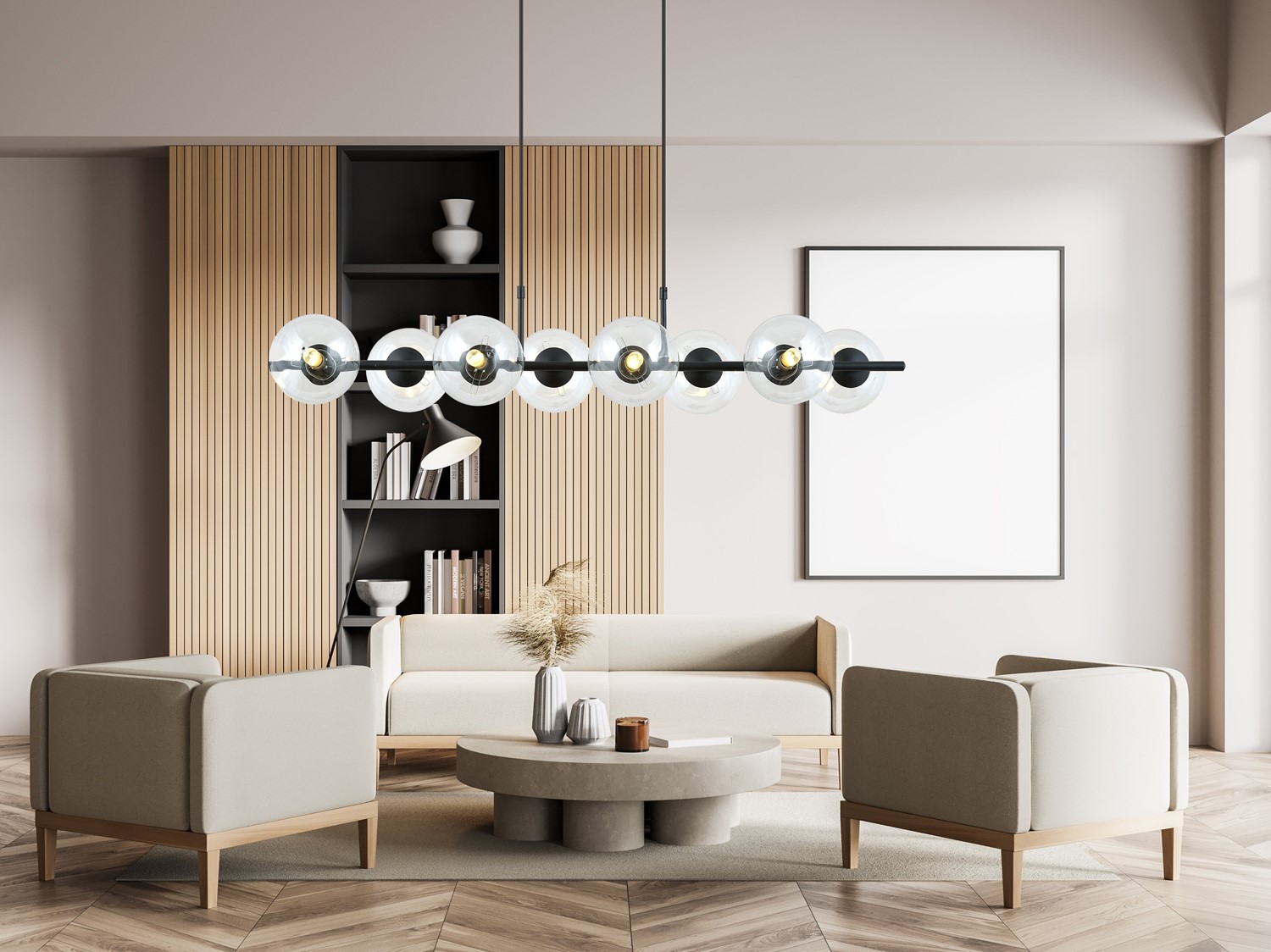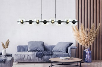 Lampa wisząca RORY to wyjątkowy element oświetlenia, który nie tylko doskonale doświetli wnętrze, ale również stanowi stylową dekorację, dodającą mu niepowtarzalnego charakteru. Zaprojektowana z myślą o nowoczesnych trendach, ta lampa jest równie atrakcyjna w klasycznych aranżacjach, co czyni ją wszechstronnym dodatkiem do różnych stylów wnętrzarskich. Jej najnowocześniejszy design wyróżnia się lekkimi, szklanymi kloszami, które nadają oświetleniu subtelności i elegancji. Klosze te nie tylko doskonale rozpraszają światło, ale także tworzą przyjemną atmosferę, dzięki której wnętrze nabiera ciepła i wyjątkowego uroku. Jej nowoczesna forma doskonale współgra z prostymi liniami i czystymi przestrzeniami, dodając wnętrzu nowoczesności i stylu.