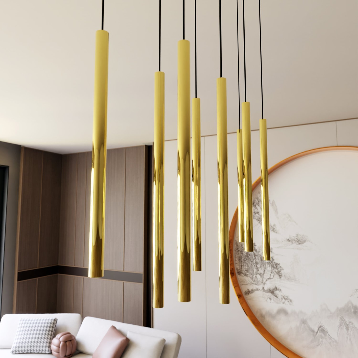 Lampa wisząca SELTER 9 w kolorze złotym to harmonijne połączenie nowoczesnego wzornictwa z elegancją. Jej wyjątkowy design sprawia, że jest nie tylko praktycznym źródłem światła, ale także efektownym elementem dekoracyjnym, który nadaje pomieszczeniu wyjątkowego charakteru.Nasz produkt wyróżnia się nowoczesnym podejściem do oświetlenia. Jego wydłużona konstrukcja z delikatnymi zdobieniami tworzy unikalny efekt wizualny, który przykuwa uwagę i nadaje wnętrzu nowoczesnego charakteru. Złote wykończenie dodaje lampie elegancji i wyrafinowania, podkreślając jednocześnie jej nowoczesny design. Delikatne zdobienia nadają jej subtelności, sprawiając, że stanowi doskonałe uzupełnienie aranżacji wnętrz zarówno w stylu minimalistycznym, jak i bardziej ekskluzywnym.