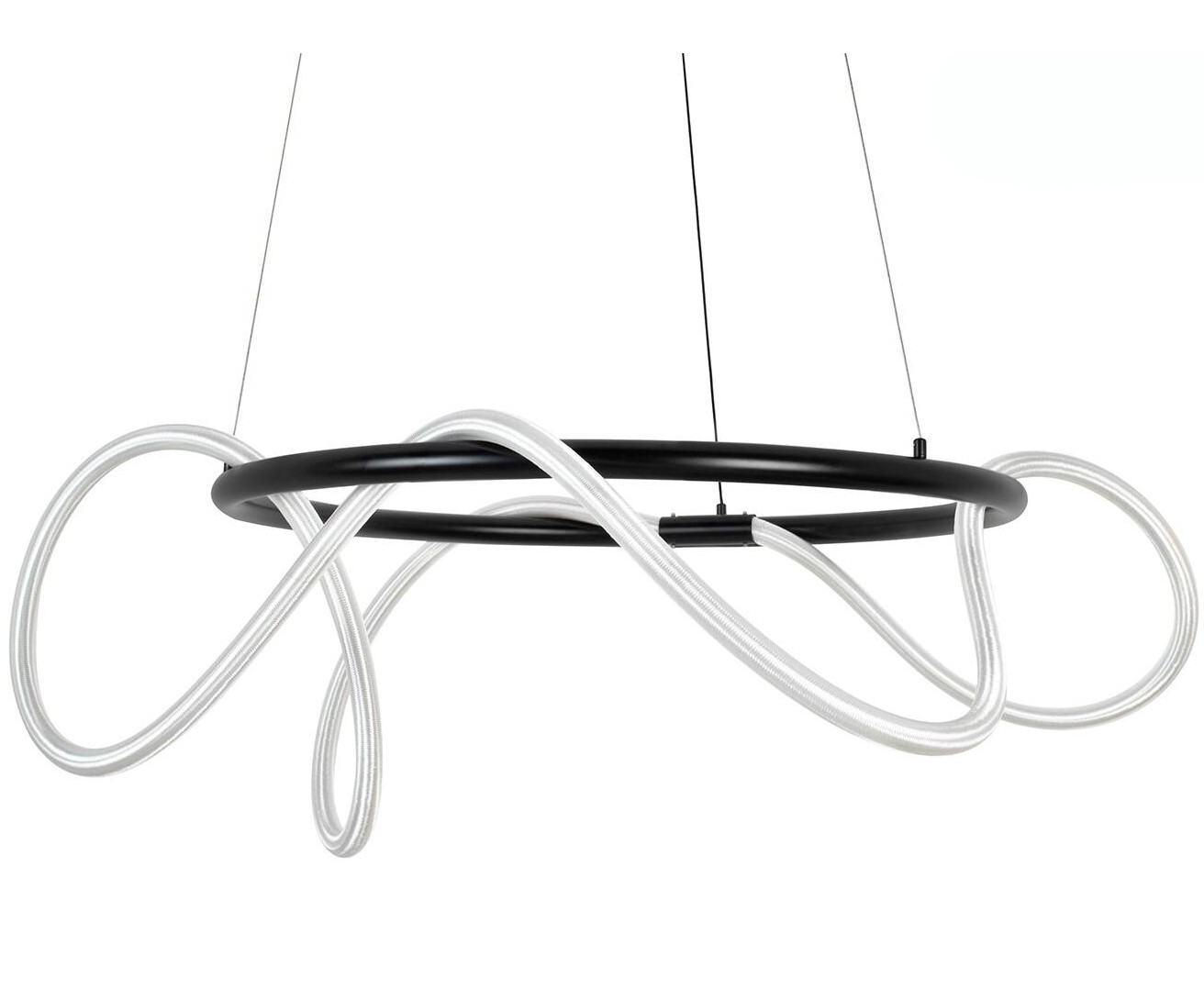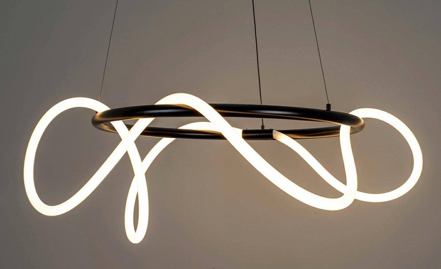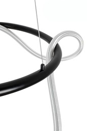 - Unikalny Design: Charakterystyczny okrągły, metalowy stelaż w kolorze głębokiej czerni przeplata się z elastycznym "wężem" w oplocie z tkaniny, tworząc fascynującą grę form i materiałów.