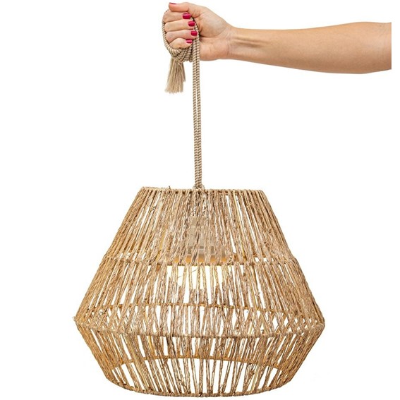 Lampa wisząca NEW GARDEN SISINE 30 BATTERY BATTERY. Lampa wisząca Sisine wyróżnia się inspirowanym śródziemnomorskim designem. Klosz wykonany jest ręcznie z naturalnych włókien przymocowanych do czarnego kabla o długości 300 cm, dzięki czemu możesz dostosować wysokość do własnych upodobań. Światła do użytku wewnętrznego i zewnętrznego.