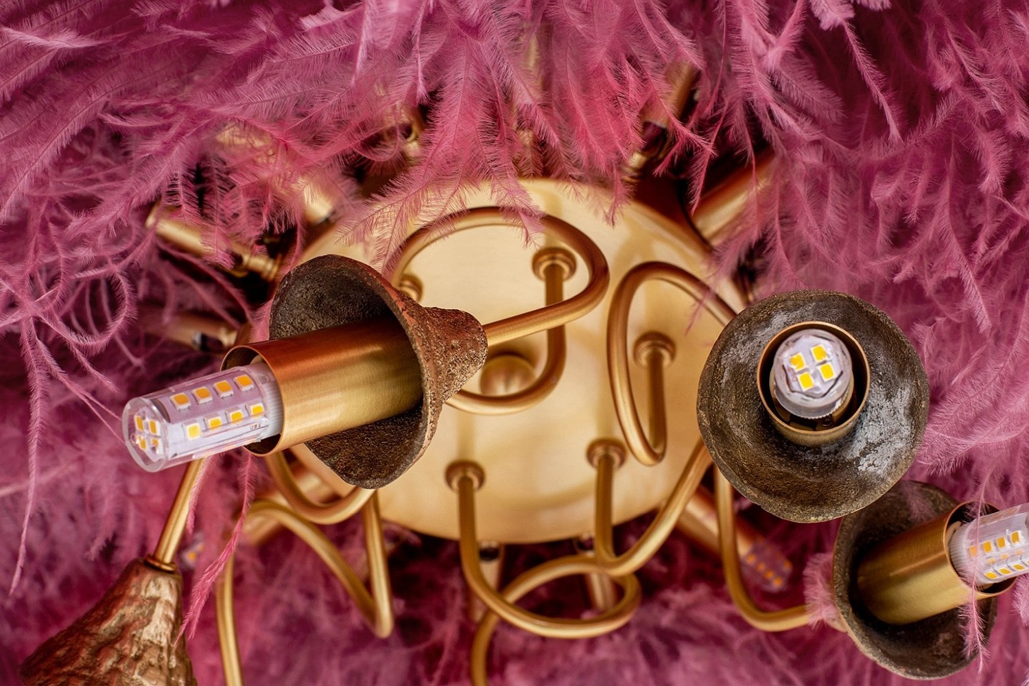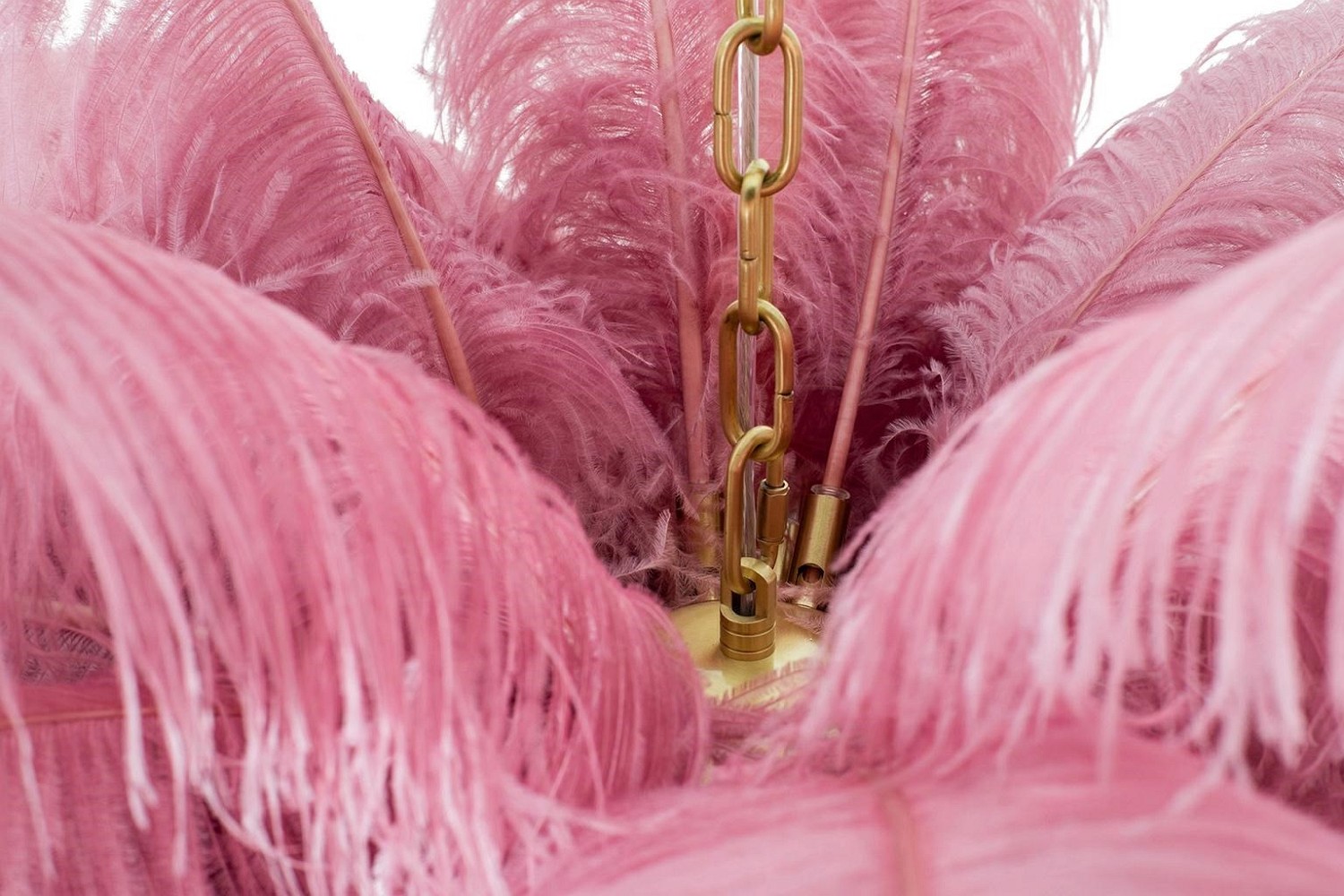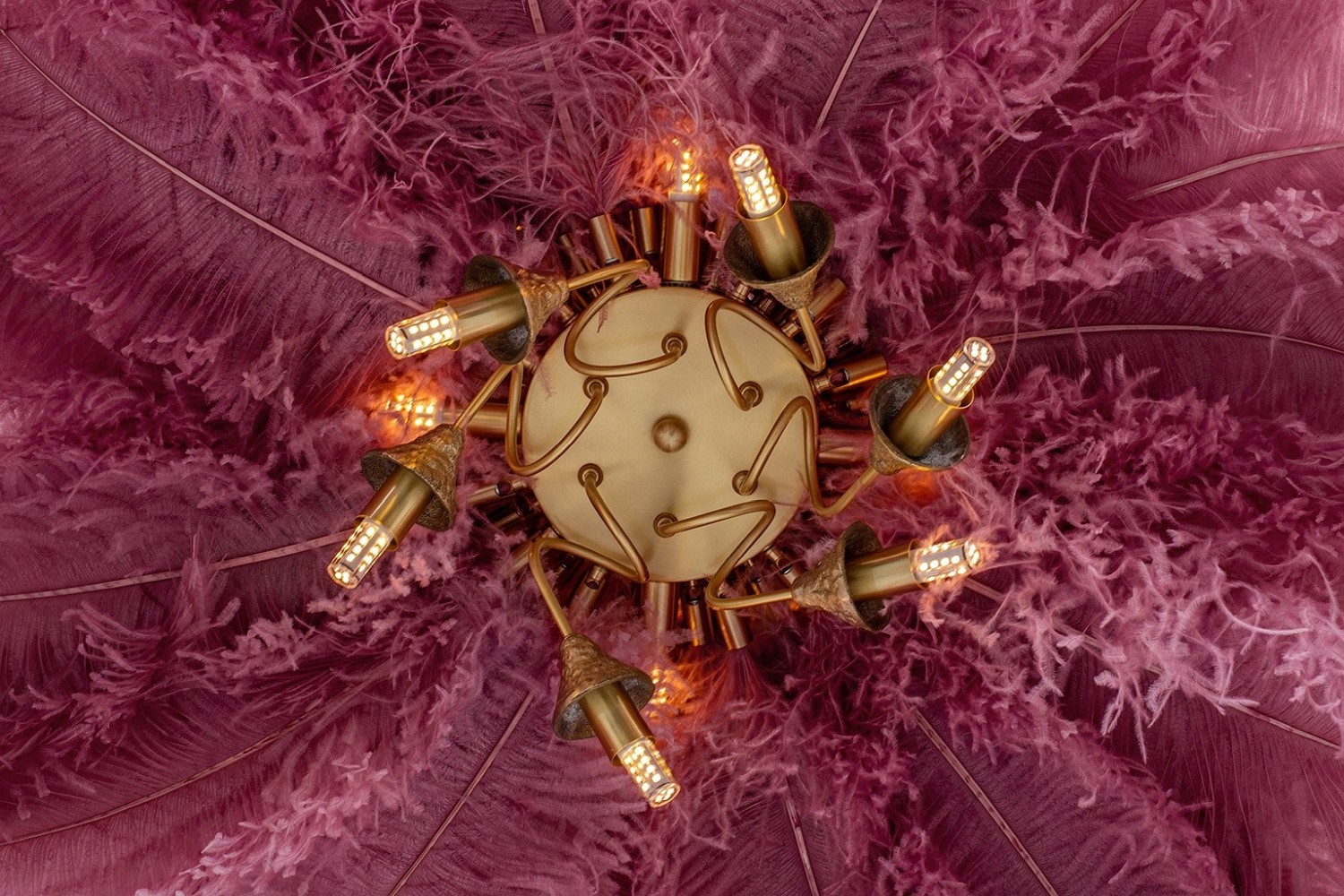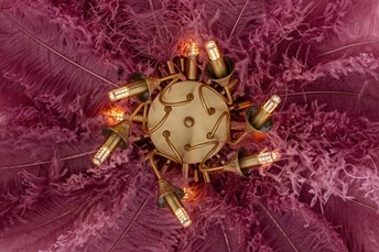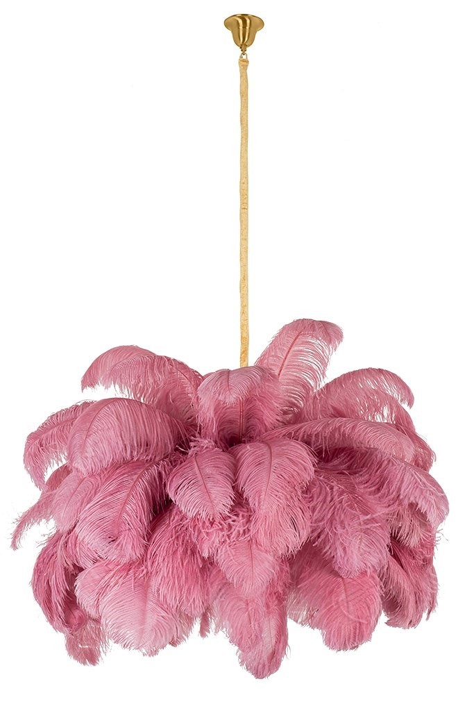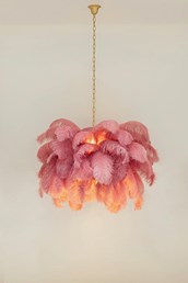 Klosz tworzy 80 sztuk gęsto ułożonych, naturalnych strusich piór o długości 55-60 cm, którymi możemy regulować wysokość całkowitą oraz kształt lampy.