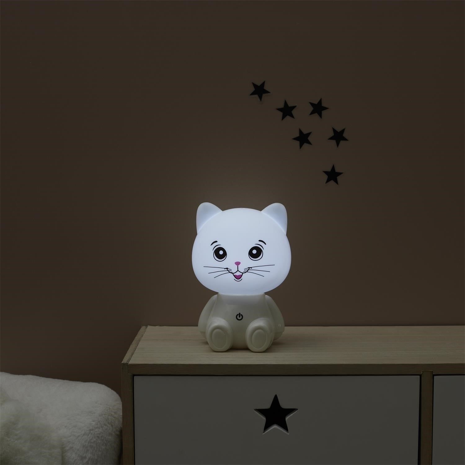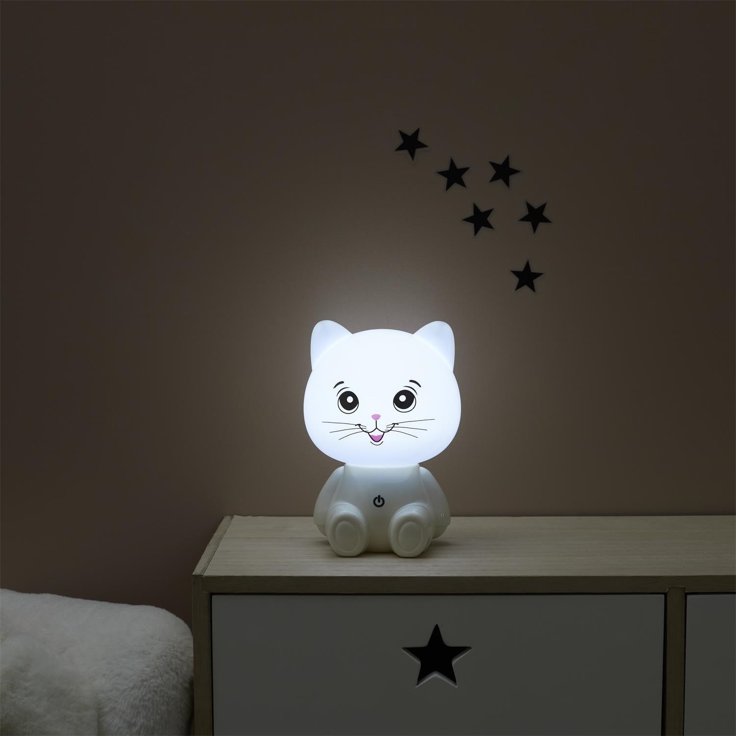 Lampka nocna w kształcie kota to idealny towarzysz nocnych chwil. Jej białe wykończenie i miękkie światło tworzą przytulną atmosferę, a zasilanie USB zapewnia wygodę użytkowania.