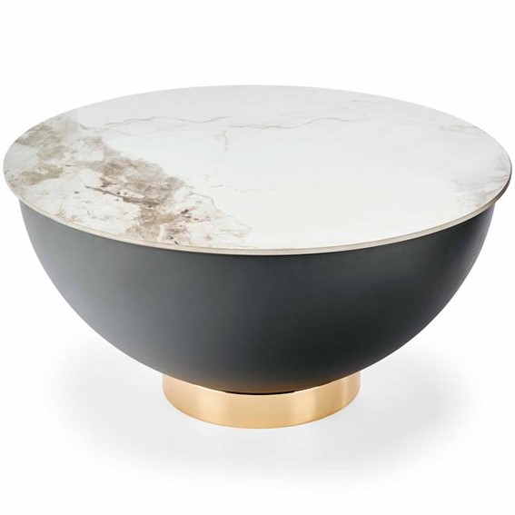Mały stolik kawowy CECILIA to propozycja nowoczesnego designerskiego stolika do sofy w salonie. Okrągły stolik kawowy ma ceramiczny blat imitujący biały marmur i stalową podstawę malowaną proszkowo w kolorze szarym i złotym. Takie zestawienie kolorystyczne nadaje meblom modny design, który doskonale komponuje się z typowym nowoczesnym wnętrzem w stylu glamour. Dekoracyjna podstawa nadaje meblom niepowtarzalny wygląd i stabilne oparcie. Stolik kawowy CECILIA to idealny dodatek do wnętrza salonu.