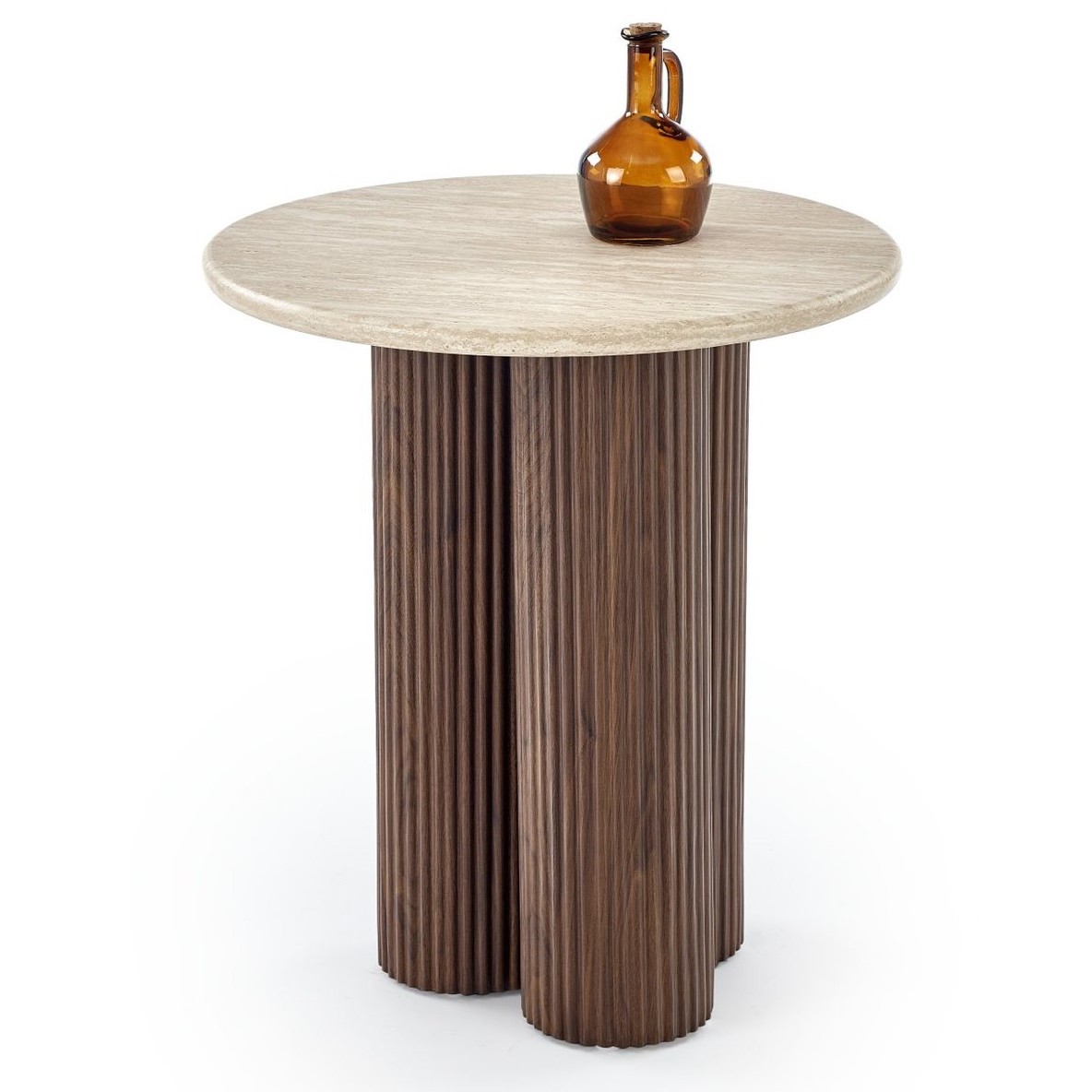 Ława DOROTEA_S to elegancki mebel, który doskonale wkomponuje się w nowoczesne wnętrza. Jej okrągły blat o średnicy 50 cm wykonany jest z okleinowanego MDF-u w kolorze trawertynu, co nadaje mu naturalny i stylowy wygląd. Podstawa w odcieniu orzecha, również z MDF-u, charakteryzuje się ryflowaną strukturą, dodającą ławie unikalnego charakteru. Ława DOROTEA_S łączy w sobie nowoczesny design z wysoką jakością wykonania, stanowiąc zarówno praktyczny, jak i estetyczny element wyposażenia wnętrza.