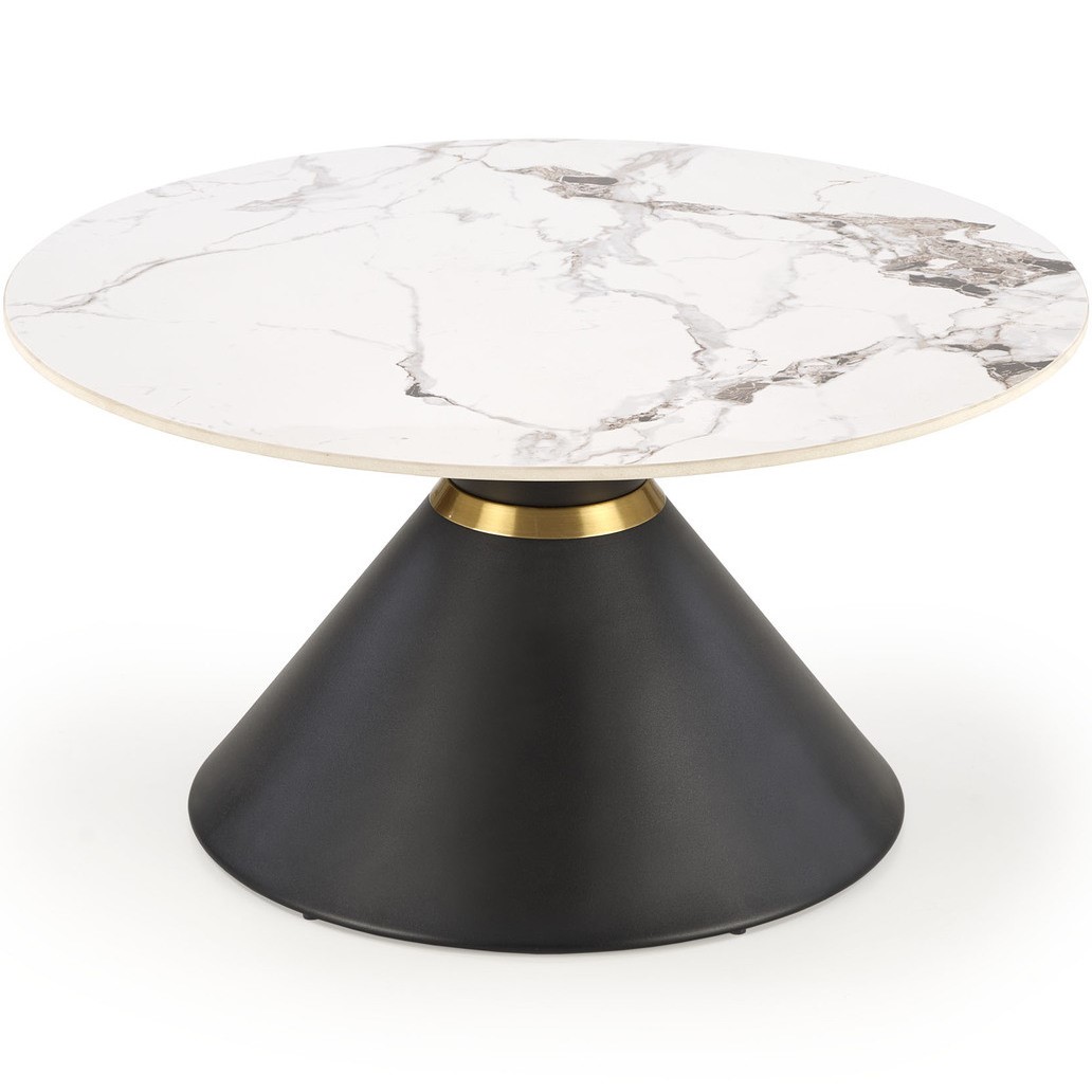 Blat ławy imituje biały marmur, co nadaje jej niezwykle eleganckiego i szlachetnego wyglądu. To wykończenie dodaje przestrzeni wyjątkowego uroku i prestiżu.Wyrafinowana, stozkowa forma czarnej stopy sprawia, że ława prezentuje się nie tylko nowocześnie, ale również zaskakująco oryginalnie. To element, który przyciąga uwagę i nadaje całości unikalny charakter.