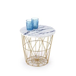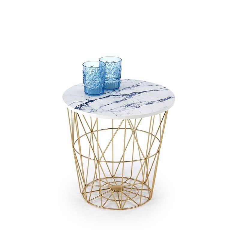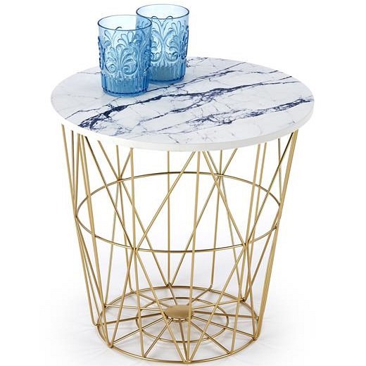 Ława loftowa HARISSA G wykonana jest z płyty MDF pokrytej okleiną w kolorze biały marmur. Spód stolika kawowego wykonany jest ze stali malowanej proszkowo na kolor złoty. Malowane proszkowo elementy są trwałe, nierdzewne i odporne na mechaniczne uszkodzenia powłoki. Blat MDF jest wytrzymały, odporny na działanie wyższych temperatur, niewrażliwy na zarysowania i tarcie. Pokazana ławka posiada zdejmowany pokrowiec, dzięki czemu możemy jej również używać jako wielofunkcyjnego kosza do przechowywania, dzięki czemu zachowamy porządek i będziemy mieć wszystkie rzeczy pod ręką w jednym miejscu.