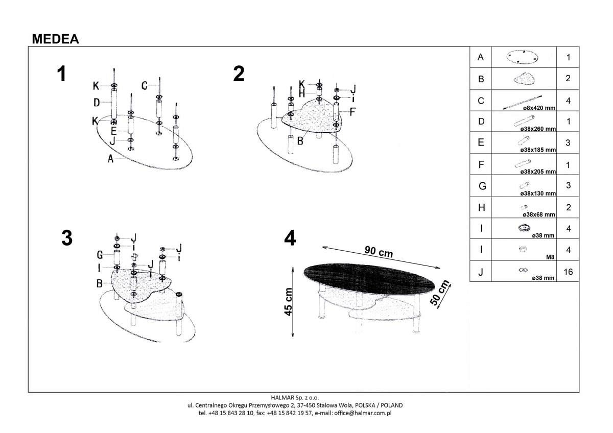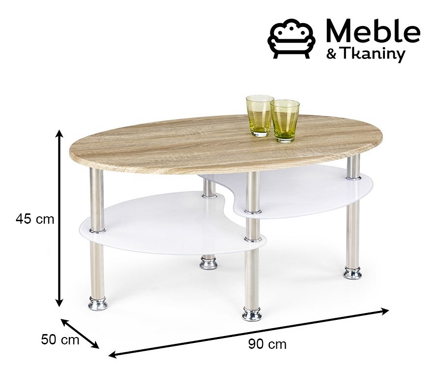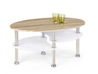 Elipsowata ława Medea idealnie sprawdzi się wszędzie tam, gdzie potrzebujemy charakterystycznego akcentu dekoracyjnego. Posiada trzy powierzchnie użytkowe. Górna wykonana została z laminowanej płyty MDF w kolorze dębu sonoma. Dwie dolne, ułożone schodkowo, to natomiast białe szkło. Połączenie to nadaje temu modelowi uniwersalnego charakteru, który sprawdzi się w każdym nowoczesnym pomieszczeniu.