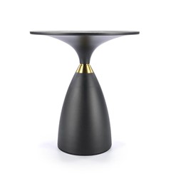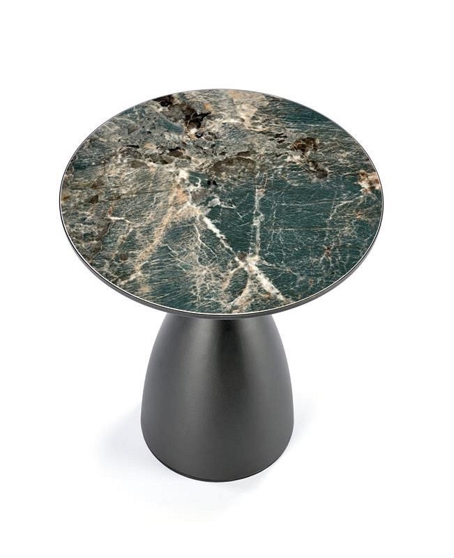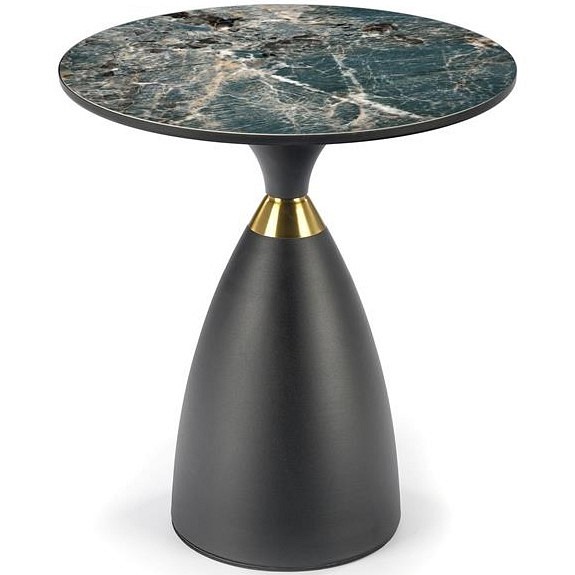 Stolik MORENA o średnicy 50 cm to mały stolik kawowy do pokoju dziennego, który dzięki swojej kolorystyce i kształtom doskonale wpasuje się w nowoczesne wnętrze, zwłaszcza urządzone w stylu glamour. Stolik kawowy wykonany jest z połączenia ceramiki i stali malowanej proszkowo. Okrągły blat stolika kawowego z zielonego marmuru wsparty jest na jednej stabilnej czarnej nodze ze złotym elementem dekoracyjnym pod spodem. Stolik kawowy MORENA daje wiele możliwości ustawienia, a postawiony obok fotela lub sofy służy głównie do codziennego relaksu przy kawie i książce.