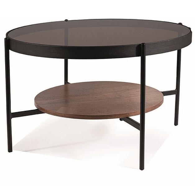 Blat z bursztynowego szkła hartowanego dodaje jej elegancji i wyjątkowego charakteru. Półka z MDF-u z okleiną naturalną w kolorze orzecha zapewnia dodatkową przestrzeń do przechowywania. Stelaż z metalu malowany na matową czerń gwarantuje stabilność i trwałość mebla. Maksymalne obciążenie do 20 kg pozwala na bezpieczne umieszczanie przedmiotów codziennego użytku.
