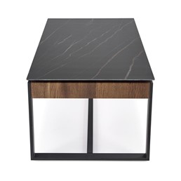 Nowoczesny stolik kawowy RAMONA w stylu loft do salonu jest spiekany i wykonany z płyty MDF, czarnego marmuru i lakieru w kolorze orzecha na czarnej podstawie ze stali malowanej proszkowo. Prostokątny stolik kawowy z ozdobną osłoną to propozycja dla miłośników eleganckich i prostych rozwiązań. Umieszczony w salonie nowoczesny stolik kawowy RAMONA o wymiarach 121×61 przykuwa uwagę gości i dopełnia wnętrze tego pokoju. Stolik kawowy z prostokątnym blatem w salonie pełni bardzo ważną rolę, jest ozdobą, ale też bardzo funkcjonalnym meblem. Funkcjonalny stolik kawowy daje nam miejsce na odłożenie przekąsek i napojów podczas relaksu na sofie lub spotkania z przyjaciółmi na pogawędkę. Ława ta z pewnością odmieni wystrój wielu salonów, pozwalając na wprowadzenie jej do różnych mieszkań - nowoczesnych, a nawet glamour.