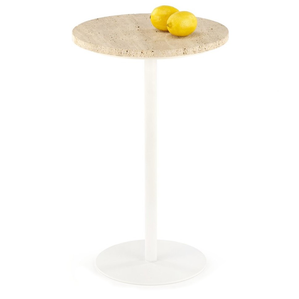 Ta nowoczesna ława to esencja elegancji i funkcjonalności w jednym. Została zaprojektowana w stylu nowoczesnym, co czyni ją idealnym dodatkiem do współczesnych aranżacji wnętrz. Stelaż wykonany z metalu w kolorze białym nadaje ławie lekkości i subtelnego wyrazu. Okrągły blat wykonany z kamienia - trawertynu prezentuje się wyjątkowo stylowo i luksusowo. Kamień ten jest nie tylko trwały, ale także dodaje ławie charakteru i elegancji, nadając wnętrzu wyjątkowego uroku. Ze swoją kompaktową budową, o szerokości 40 cm i wysokości 45 cm, ta ława doskonale sprawdzi się nawet w niewielkich przestrzeniach, dodając im subtelny akcent nowoczesnego designu.