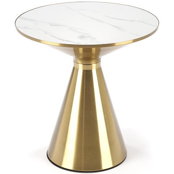 Elegancki stolik kawowy TRIBECA o średnicy 50 cm to mały stolik kawowy, który dzięki pięknemu kształtowi i atrakcyjnej kolorystyce jest doskonałym wyborem do salonu w stylu glamour. Stolik kawowy wykonany jest z połączenia ceramiki z białego marmuru i stali nierdzewnej w kolorze złotym. Stożkowa podstawa zapewnia stabilne podparcie całej konstrukcji. Stolik kawowy TRIBECA daje wiele możliwości ustawienia, a dzięki zastosowaniu wysokiej jakości materiałów będzie wyjątkową ozdobą salonu przez długie lata.