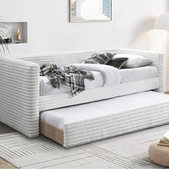 Łóżko z wysuwanym dolnym materacem to praktyczne rozwiązanie, które doskonale sprawdzi się w niewielkich przestrzeniach. Dzięki tapicerowanej tkaninie mebel prezentuje się elegancko i nowocześnie, a jednocześnie jest przyjemny w dotyku. Dolny, wysuwany materac pozwala w szybki i wygodny sposób uzyskać dodatkowe miejsce do spania, co czyni je idealnym wyborem do pokoju gościnnego lub dla rodzeństwa. Stabilna konstrukcja zapewnia trwałość i bezpieczeństwo użytkowania, a miękka tkanina dodaje wnętrzu przytulności.