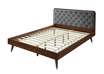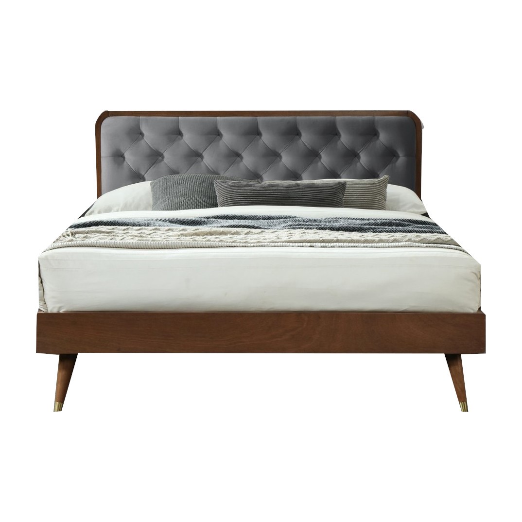 To eleganckie łóżko wyróżnia się nowoczesnym designem i wysoką jakością wykonania. Tapicerowane, pikowane wezgłowie w szarym odcieniu nadaje mu stylowy i luksusowy wygląd, zapewniając jednocześnie wygodne oparcie. Solidna drewniana rama w ciepłym odcieniu brązu gwarantuje trwałość i stabilność. Smukłe, zwężane nogi z metalowymi wykończeniami dodają mu lekkości i nawiązują do stylu retro. Łóżko doskonale sprawdzi się w nowoczesnych, klasycznych oraz loftowych aranżacjach wnętrz. Dzięki swojemu ponadczasowemu wyglądowi stanie się ozdobą każdej sypialni, łącząc funkcjonalność z elegancją.
