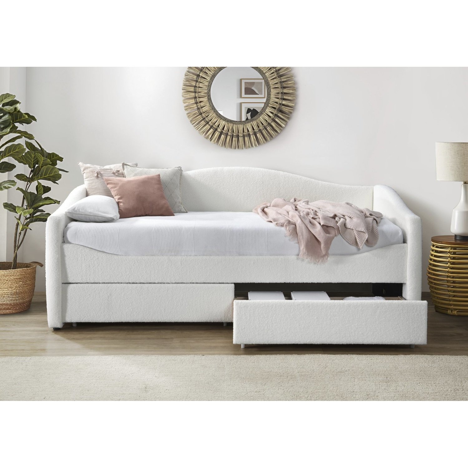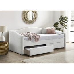 Przedstawiamy łóżko Caydence o wymiarach 90x200 cm w eleganckim kolorze kremowym, które nie tylko zachwyca swoim wyglądem, ale także oferuje praktyczne miejsce do przechowywania dzięki dwóm szufladom umieszczonym z dolnej strony.