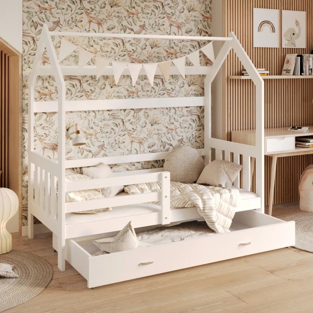Łóżko AVA w formie domku to marzenie każdego dziecka. Dzięki minimalistycznej konstrukcji z białym wykończeniem doskonale wpisuje się w skandynawski styl wnętrz. Otwarta forma zachęca do zabawy, jednocześnie zapewniając spokojny i komfortowy sen. Wysokiej jakości materiały oraz staranne wykonanie gwarantują trwałość i bezpieczeństwo użytkowania. Model AVA sprawdzi się w każdej dziecięcej aranżacji – zarówno nowoczesnej, jak i klasycznej – oferując przestrzeń do wypoczynku i zabawy w jednym.