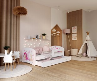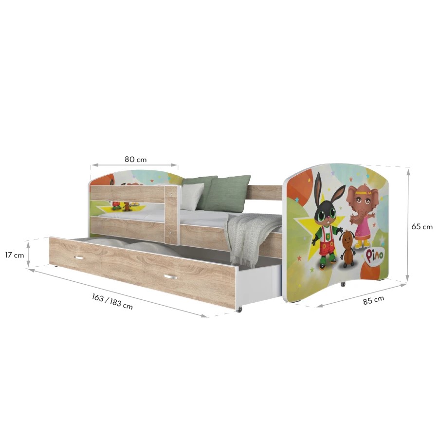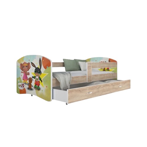 JOHNY to kolorowe łóżko dziecięce, które zachwyci każdego fana bajkowych bohaterów. Barwna grafika na froncie przyciąga uwagę i stymuluje wyobraźnię, tworząc przyjazne i radosne miejsce do spania i zabawy. Model wyposażony został w praktyczną szufladę, idealną na pościel lub zabawki. Zaokrąglone krawędzie i niska konstrukcja zapewniają bezpieczeństwo użytkowania, co czyni to łóżko idealnym wyborem dla młodszych dzieci.