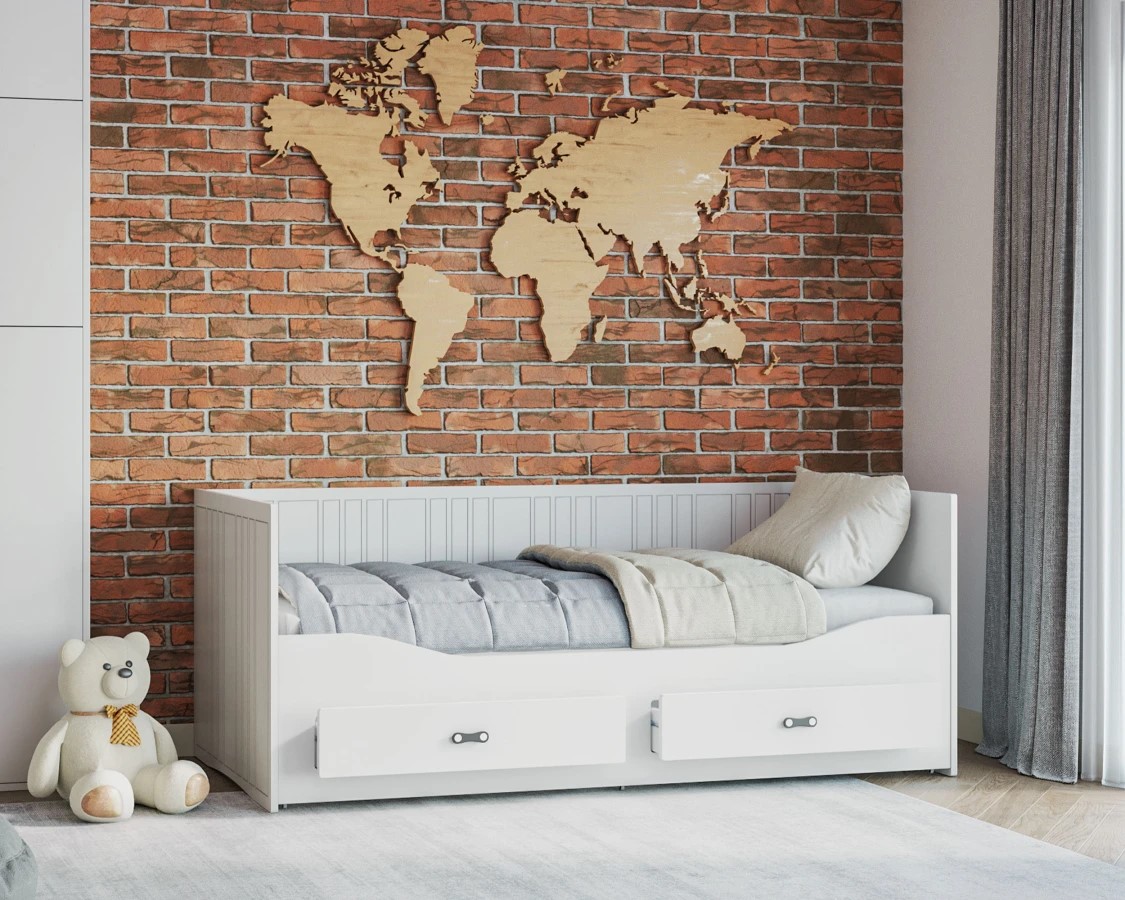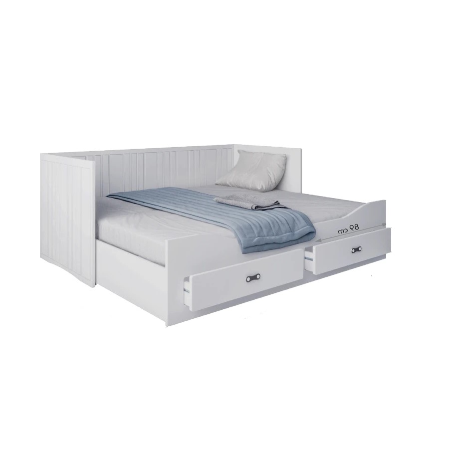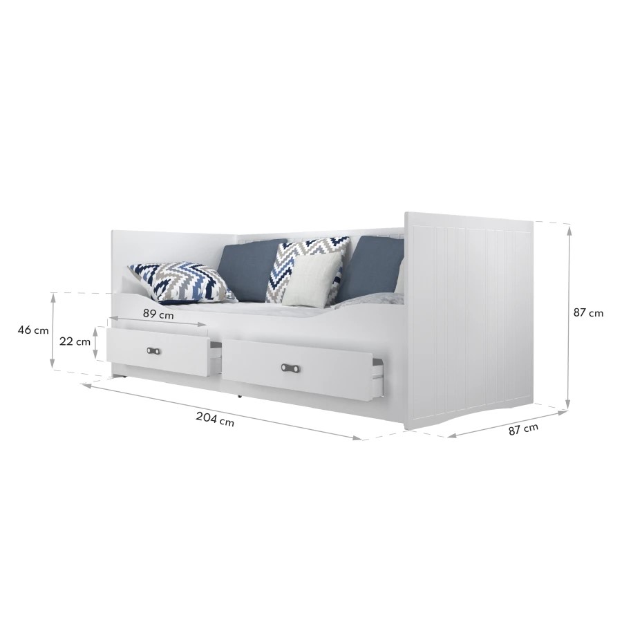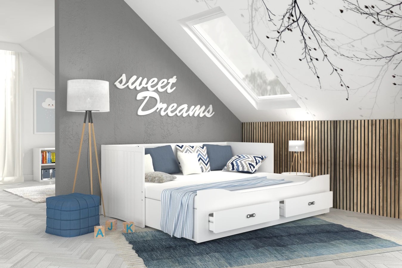 HARPER to kompaktowe łóżko stworzone z myślą o małych przestrzeniach. Składana konstrukcja sprawia, że w kilka chwil można zamienić je w wygodną sofę lub zwolnić przestrzeń do codziennego użytku. Wbudowany materac zapewnia komfortowy sen bez potrzeby dokładania dodatkowych warstw. Dwie pojemne szuflady umieszczone pod siedziskiem umożliwiają przechowywanie pościeli, zabawek lub tekstyliów. Prosty i uniwersalny wygląd pozwala łatwo wkomponować mebel w nowoczesne, minimalistyczne lub młodzieżowe aranżacje. HARPER to idealne rozwiązanie do pokoju dziecka, gościnnego lub małej kawalerki.