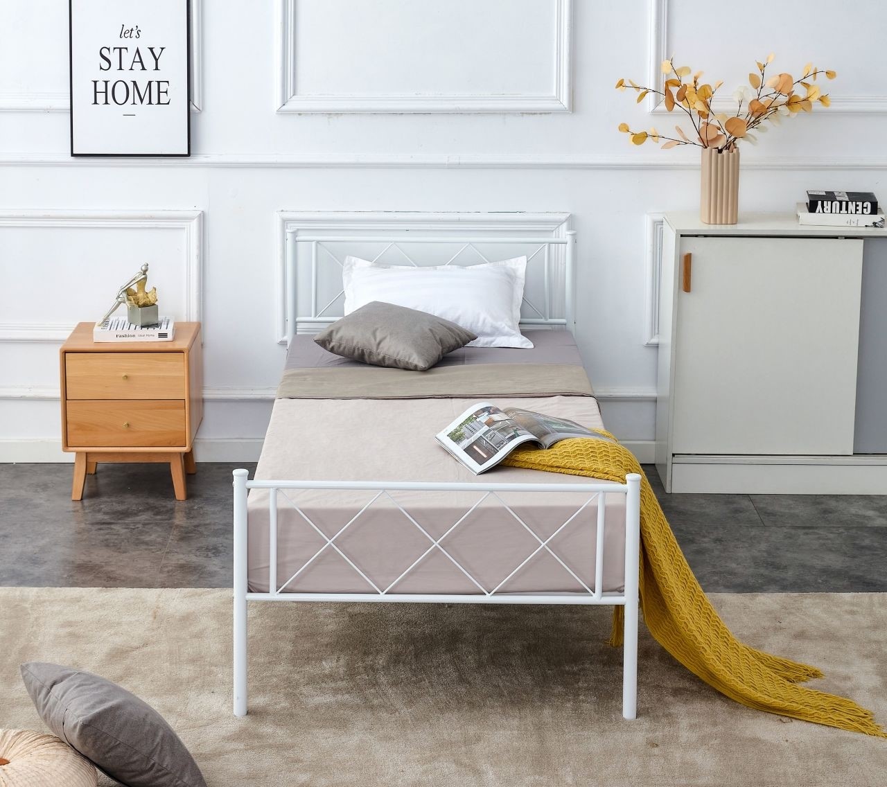 To łóżko metalowe cechuje się solidną konstrukcją, która zapewnia stabilność i trwałość na lata. Metalowa rama jest wytrzymała i odporna na uszkodzenia, co sprawia, że idealnie nadaje się do intensywnego użytkowania. Zastosowanie prostych linii oraz geometrycznych akcentów w zagłówku i przednóżku nadaje mu nowoczesnego, minimalistycznego wyglądu, pasującego do różnych stylów wnętrz. Dzięki swojej konstrukcji łóżko jest również łatwe w montażu i demontażu, co ułatwia transport i przestawianie w razie potrzeby. Metalowa powierzchnia jest odporna na zarysowania, co wpływa na jego estetykę nawet po dłuższym czasie użytkowania. Dodatkowo, zastosowanie materiału łatwego do czyszczenia sprawia, że łóżko to jest wyjątkowo praktyczne i higieniczne.