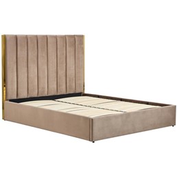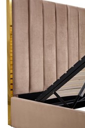 Łóżko PALLAZO VELVET to eleganckie łóżko do sypialni w stylu glamour. Łóżko tapicerowane jest klasyczną tkaniną Velvet w kolorze beżowym. Tkanina jest miękka i delikatnie mieni się w słońcu. Łóżko wyposażone jest w podnoszoną ramę łóżka. Boki zagłówka wykończone są stalą nierdzewną w kolorze złotym, która stanowi swego rodzaju zabezpieczenie dla mebli. Piękny zagłówek z ozdobnymi przeszyciami zapewnia nam wygodne i wygodne oparcie podczas czytania książek czy oglądania telewizji. Łóżko PALAZZO VELVET to nie tylko wygodne łóżko, ale także bardzo dekoracyjny mebel, który doskonale uzupełnia aranżację sypialni. W meblach nie ma materaca. W naszym sklepie możesz zobaczyć szeroki wybór materacy. Wybierz rozmiar materaca 160x200.