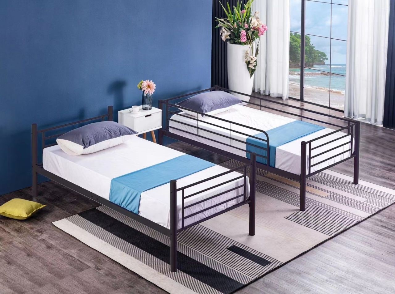 Metalowe łóżko piętrowe to praktyczne i nowoczesne rozwiązanie do małych przestrzeni. Wykonane z wytrzymałych materiałów, zapewnia stabilność i długowieczność, co czyni je idealnym wyborem do codziennego użytku. Barierki ochronne na górnym poziomie gwarantują bezpieczeństwo, szczególnie dla dzieci, a wbudowana drabinka ułatwia dostęp do wyższego łóżka. Prosty, minimalistyczny design sprawia, że łóżko świetnie komponuje się z nowoczesnymi aranżacjami wnętrz.