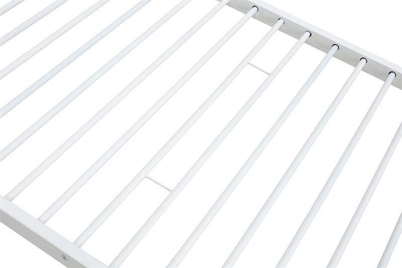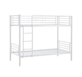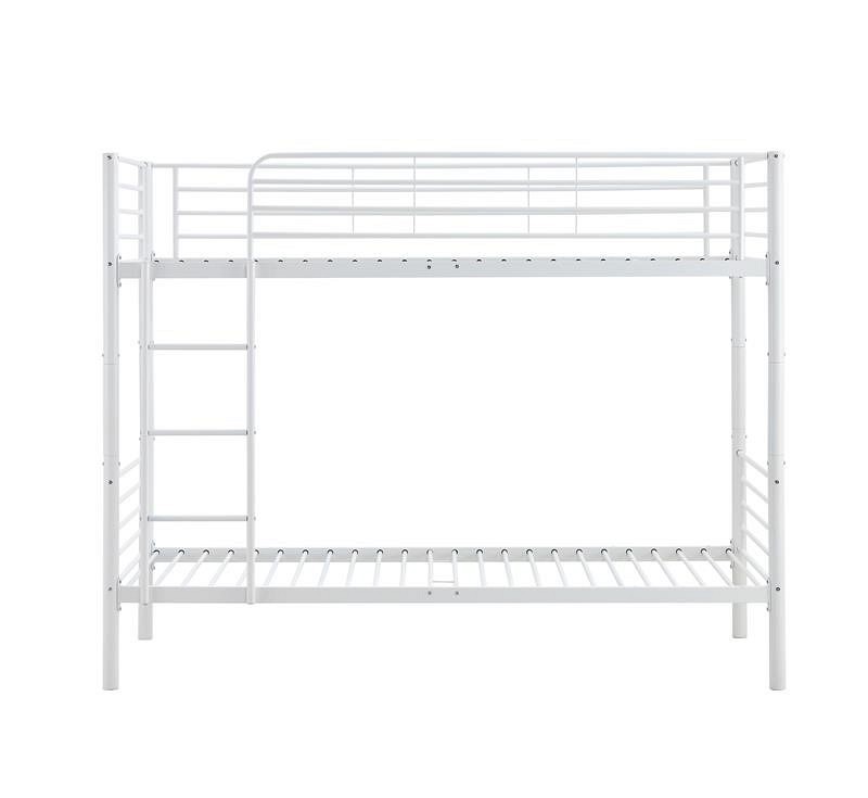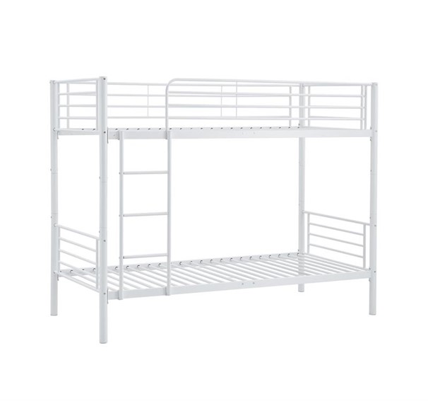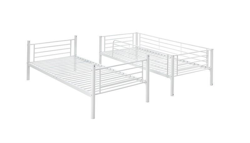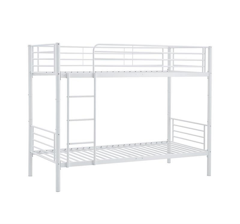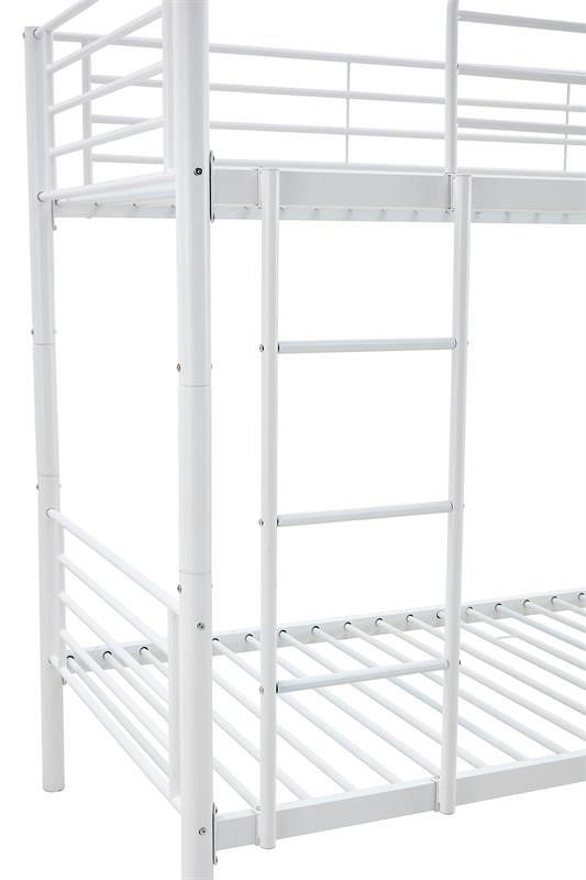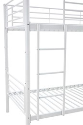 Łóżko piętrowe BUNKY to metalowe łóżko o wymiarach 90x200 wykonane w całości z białej stali proszkowej. Łóżka metalowe są mocne i trwałe, dlatego łóżko piętrowe BUNKY 90x200 posłuży nam przez długie lata. Łóżko piętrowe ma możliwość stworzenia dwóch osobnych łóżek, które sprawdzają się, gdy łóżko piętrowe nie jest potrzebne. Górna część łóżeczka wyposażona jest w barierkę ochronną, która chroni dziecko przed wypadnięciem z łóżeczka podczas snu. Dostęp do górnej koi zapewnia drabina.