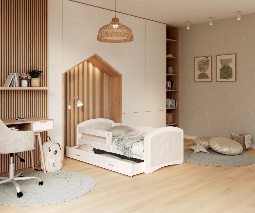 Model ELLA TRINITY to stylowe łóżko dziecięce, które łączy wygodę z eleganckim wyglądem. Tapicerowane boki i zagłówek ozdobione guzikami tapicerskimi nadają mu klasy i wyjątkowego uroku. Miękkie wykończenie podnosi komfort i bezpieczeństwo użytkowania, co jest szczególnie ważne w pokoju najmłodszych. Konstrukcja łóżka jest solidna i stabilna, a dostępne rozmiary pozwalają dopasować je do wieku i potrzeb dziecka. Model ELLA TRINITY będzie doskonałym wyborem dla rodziców ceniących funkcjonalność połączoną z ponadczasowym wzornictwem.
