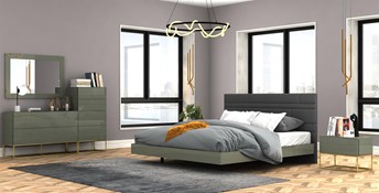 Łóżko tapicerowane w stylu modern classic w kolorze cementowej zieleni to połączenie elegancji i nowoczesności. Jego minimalistyczna forma bryły tworzy harmonijną całość, wprowadzając do sypialni subtelną estetykę. Korpus łóżka wykonany z płyty MDF na wysoki połysk dodaje mu elegancji i wyrafinowania, podczas gdy tapicerowane wezgłowie w kolorze szarym nadaje mu dodatkowej wygody i komfortu. Połączenie różnych kolorów i materiałów tworzy interesujący kontrast, który ożywia przestrzeń sypialni. To łóżko nie tylko zapewnia komfortowy sen, ale także stanowi stylowy element dekoracyjny, który nadaje sypialni niepowtarzalny charakter.