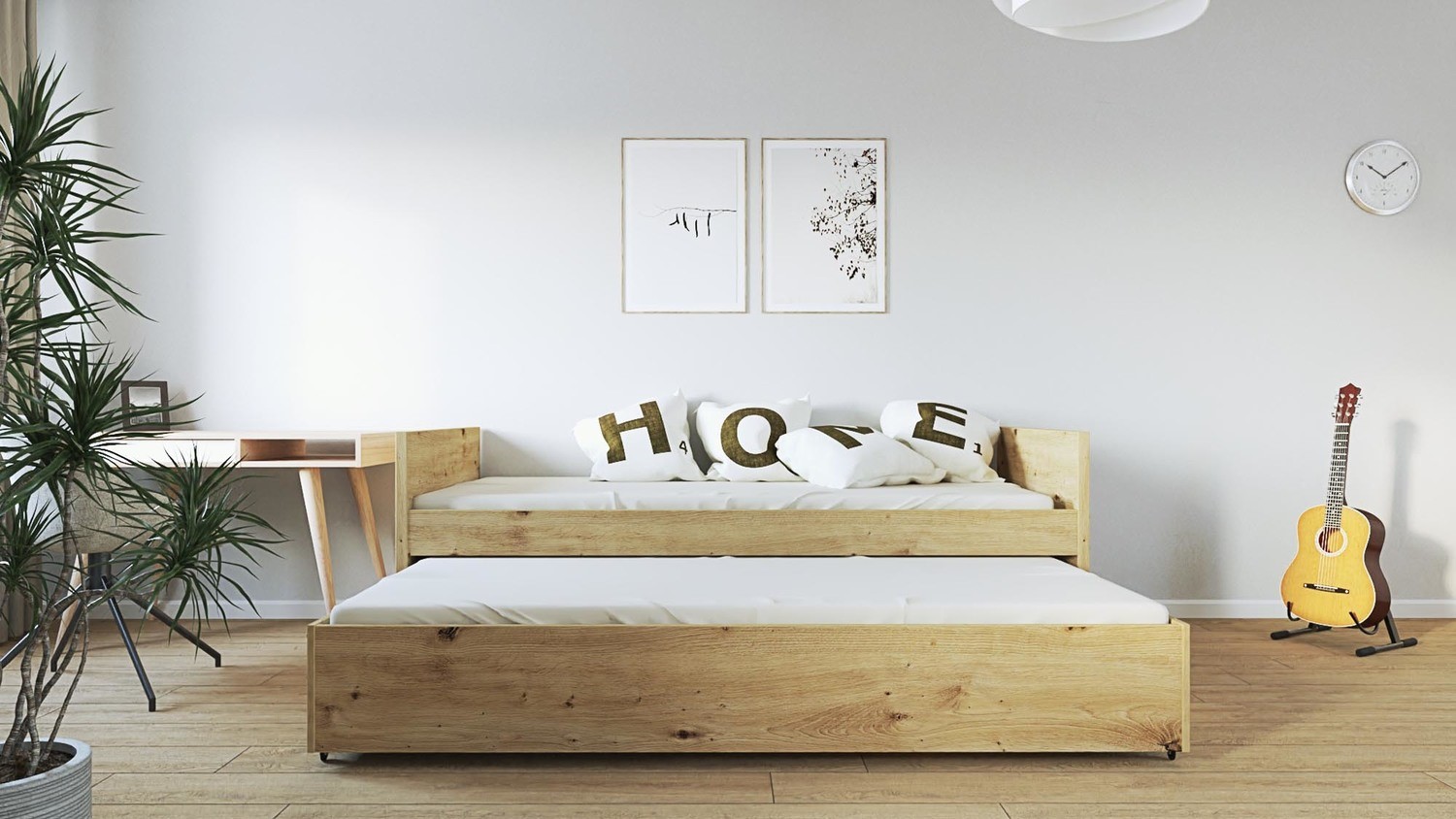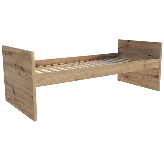 Łóżko VERSO BAZA o wymiarach 213x95x77 cm, wykonane z trwałej płyty meblowej laminowanej w kolorze dąb artisan, oferuje solidne podparcie dzięki wbudowanemu stelażowi. Bez materaca w zestawie, opcjonalnie można dokupić materac NEAPOL o wymiarach 200x90x12 cm.