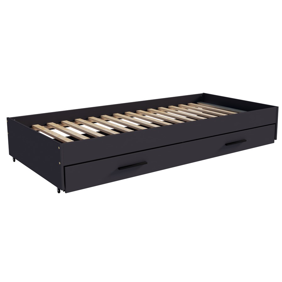 Moduł łóżka VERSO F/1S o wymiarach 205x95x34 cm, wykonany z trwałej płyty laminowanej w kolorze antracytowym. Łóżko jest sprzedawane bez materaca, ale można dokupić materac NEAPOL o wymiarach 200x90x12 cm.