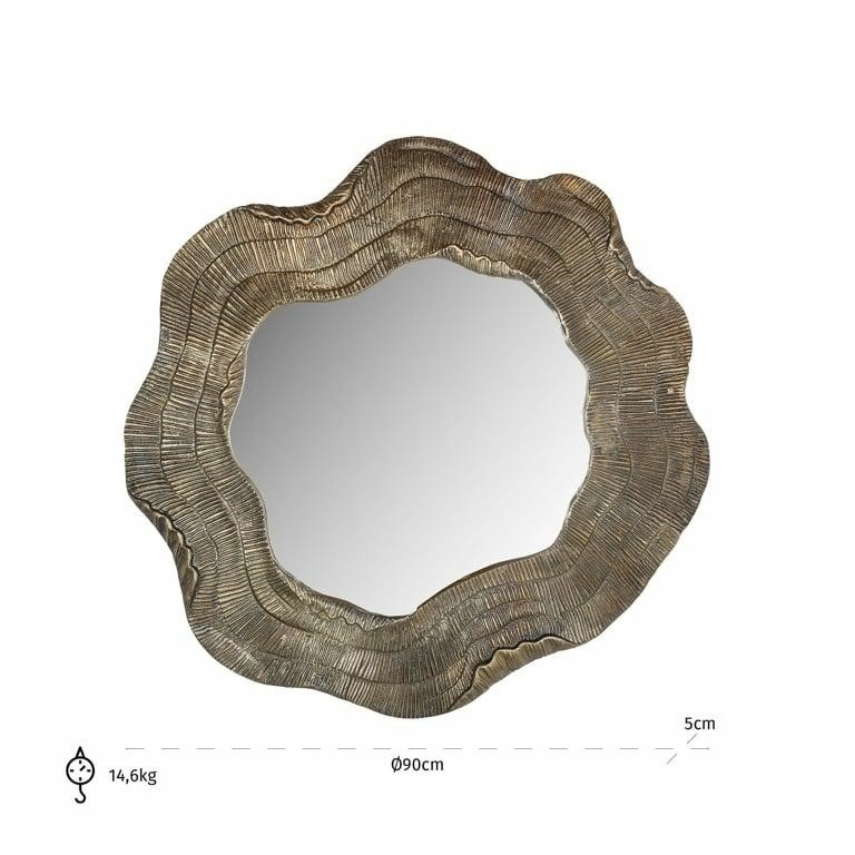 Lustro Elia to wyjątkowy element, który łączy funkcjonalność z artystycznym wykończeniem. Jego falista rama w złotym kolorze nadaje wnętrzu subtelnej elegancji, a zarazem odrobinę surowego charakteru. Idealnie pasuje do nowoczesnych i industrialnych aranżacji, wprowadzając głębię i luksusowy akcent.