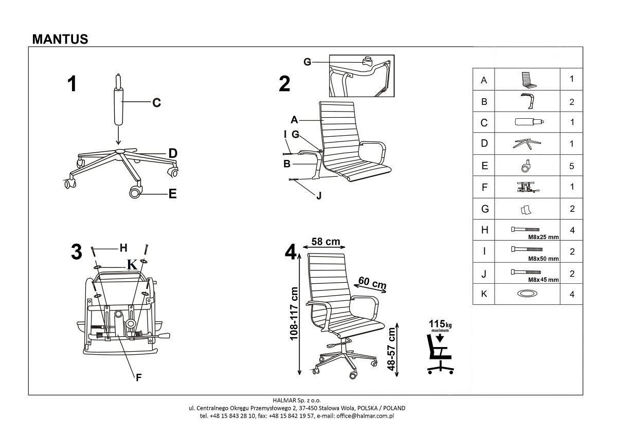 MANTUS to idealny wybór do pracy lub domowego biura. Wyróżnia go minimalizm i nowoczesny design. Wyprofilowane siedzisko oraz podłokietniki zapewniają komfort podczas pracy. Siedzisko oraz oparcie obszyto wysokiej jakości ekoskórą. Fotel jest wyposażony w mechanizm TILT pozwalający na blokadę kąta nachylenia oparcia oraz na płynną regulację wysokości siedziska. Zamocowane kółka są przeznaczone do powierzchni miękkich. W naszej ofercie posiadamy również w sprzedaży kółka przeznaczone do powierzchni twardych.