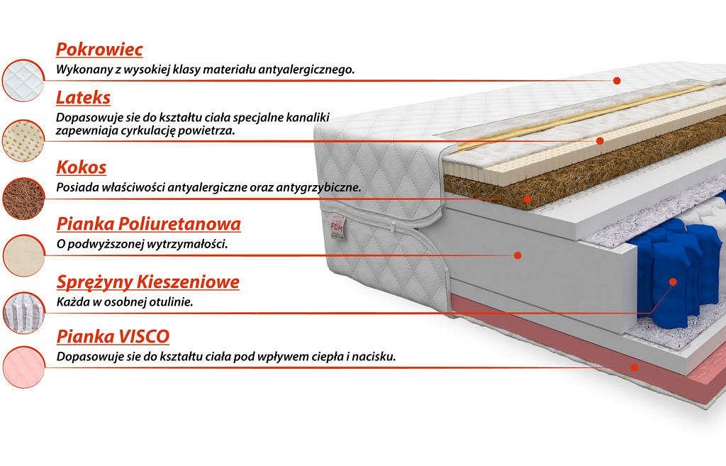 Najpopularniejszymi modelami są materace kieszeniowe, które dzielą materac na różne strefy dostosowane do poszczególnych partii ciała. Duża część klientów wybiera materace piankowe, które idealnie przystosowują się do kształtu naszego ciała, ale nie odkształcają powierzchni materaca. Dzięki temu materac może służyć nam na długie lata. Dużym ułatwieniem jest materac dwustronny i dzieli się na różne strefy twardości. Bardziej twarda strona często wzbogacona jest o wkład kokosowy, dzięki czemu materac zachowuje właściwości antygrzybiczne i antyalergiczne. Podnosi on, również komfort snu zapewniając odpowiednią wentylację, zwłaszcza w letnie noce. Strona miękka świetnie otula nasze ciało w zimowe wieczory.
