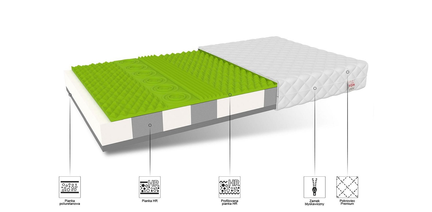 Model ADRIANO to kompozycja trzech pianek dobranych przez naszych technologów tak, aby zapewnić śpiącemu na nim dziecku jak najwyższy komfort snu. Materac powstał z połączenia strefowej pianki wysokoelastycznej HR oraz pianki poliuretanowej T25. Dodatkowa warstwa z profilowanej pianki HR dzieli materac na 7 stref, zapewniając większe uczucie komfortu. Warstwy materaca łącząc się ze sobą, zapewniają podparcie każdej strefie ciała, dbając o prawidłowe podparcie kręgosłupa. Atutem tego modelu jest jego trwałość.