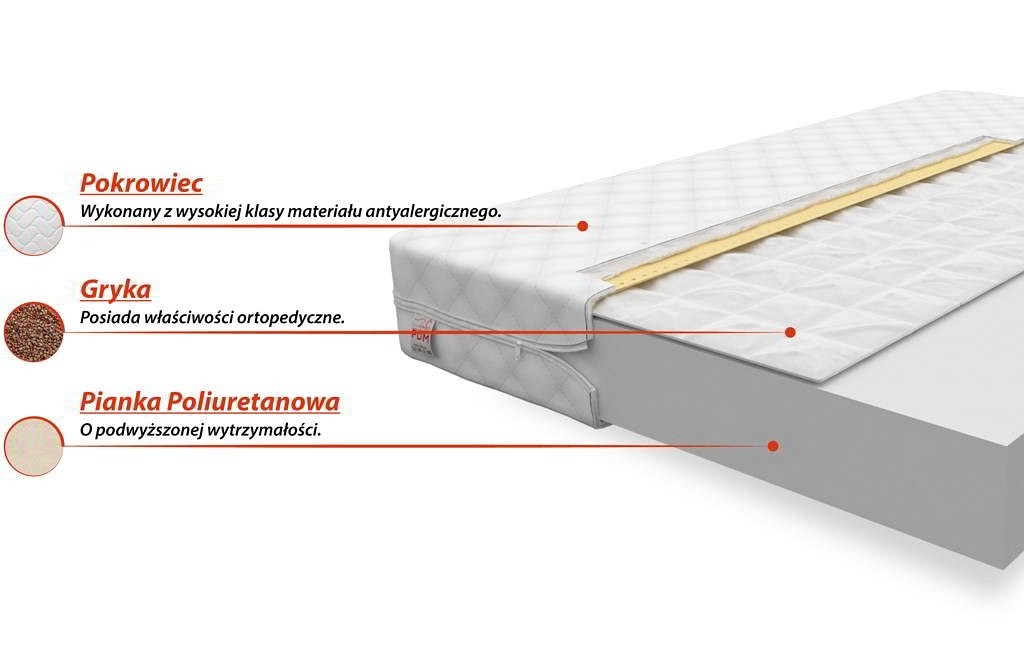 Materac BABY CARE to model dedykowany dla najmłodszych, już od pierwszych dni życia. W tym modelu rdzeń materaca stanowi pianka poliuretanowa T25. Jest to materiał, który nie odkształca się, dzięki czemu materac jest bardzo wygodny i gwarantuje komfort snu. Wysoka jakość pianki zapewnia bardzo dobre podparcie dla kręgosłupa. Jego twardość została tak dobrana, aby zapewnić swobodną zmianę pozycji. Zastosowana warstwa naturalnej łuski gryczanej ma właściwości prozdrowotne, zapobiega odleżynom i wadom kręgosłupa.