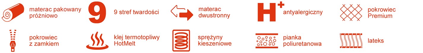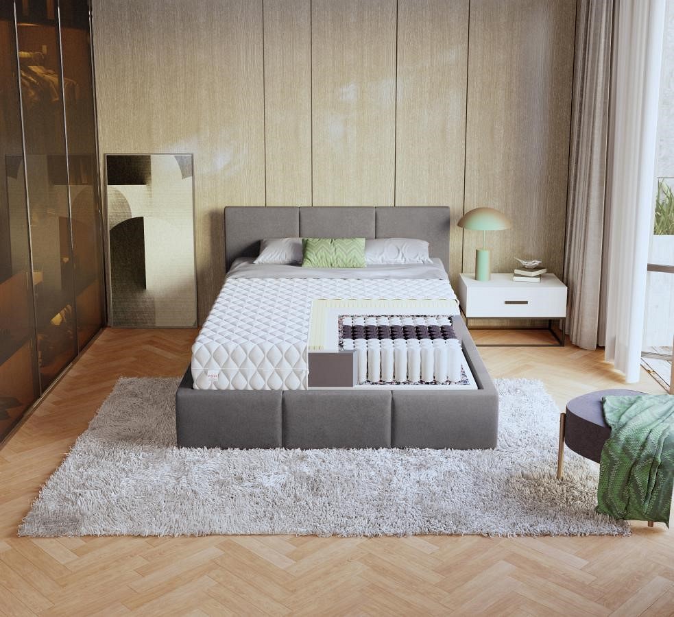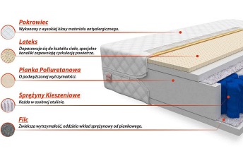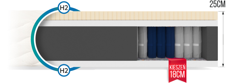 Rdzeń materaca BOLONIA MAX stanowi formatka pocketowa (kieszonkowa). Sprężyny pocketowe zostały wykonane w technologii NanoHARD, podwójnie hartowany drut znacznie przedłuża ich żywotność. Dzięki zastosowaniu 7-stref o zróżnicowanej twardości materac zapewnia ergonomiczną pozycję ciała podczas wypoczynku. Niezależna praca sprężyn, eliminuje efekt wyginania się dużej powierzchni materaca przy nacisku na jego małą powierzchnię. Dzięki czemu wszelkiego rodzaju obracanie, czy wiercenie nie będzie odczuwalne dla drugiej osoby. Wkład kieszeniowy otacza pianka poliuretanowa T25, odporna na odkształcenia.