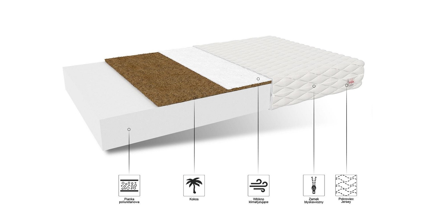 Bazę materaca CARINI MAX stanowi pianka poliuretanowa T25, o podwyższonej wytrzymałości i dobrej przepuszczalności powietrza. Zapewnia świetną izolację termiczną oraz nie odkształca się, dzięki czemu materac jest wygodny i gwarantuje komfort spania. Z jednej strony została w nim zastosowana warstwa naturalnego kokosu, która usztywnia materac oraz nadaje mu właściwości prozdrowotne i antyalergiczne.