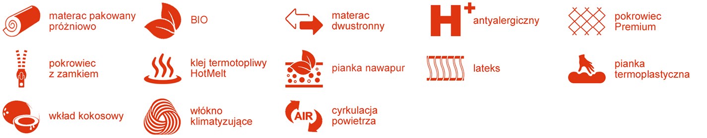 Zastosowana w materacu ERGO energetyczna pianka Bio Foam cechuje się niezwykłą elastycznością oraz odpornością na odkształcenia. Dzięki specjalnym kanalikom zapewnia doskonałą cyrkulację powietrza, a także niespotykany komfort spania. Wysoka zawartość olejków roślinnych oraz gładka i delikatna struktura sprawia, że materac jest wyjątkowo przyjemny w dotyku. Kokos zapewnia większą stabilizację i lekko utwardza powierzchnię. Warstwa lateksu zapewnia doskonałe dopasowanie do kształtu ciała, zapewniając wysoki komfort snu oraz zwiększając wentylację materaca. Pianka termoplastyczna VISCO idealnie dopasowuje się do ciała pod wpływem ciepła.