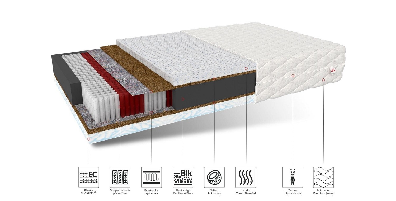 Jego konstrukcja jest osadzona na formatce multipocketowej. Dzięki właściwościom sprężyn materac jest podzielony na 7 stref podparcia ciała. Oznacza to, że uginanie się pod poszczególnymi częściami ciała jest zróżnicowane, co daje komfort i wytchnienie po ciężkim dniu. Ponadto sprężyny pracują każda oddzielnie, co sprawia, że dwie osoby śpiące obok siebie nie będą odczuwały ruchu lub wiercenia się drugiej.
