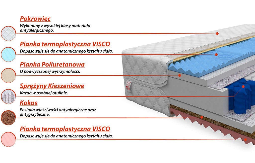 Bazę materaca GINASO stanowi formatka pocketowa (kieszonkowa). Sprężyny pocketowe zostały wykonane w technologii NanoHARD, podwójnie hartowany drut znacznie przedłuża ich żywotność. Dzięki zastosowaniu 7-stref o zróżnicowanej twardości materac zapewnia ergonomiczną pozycję ciała podczas wypoczynku. Niezależna praca sprężyn, eliminuje efekt wyginania się dużej powierzchni materaca przy nacisku na jego małą powierzchnię. Dzięki czemu wszelkiego rodzaju obracanie, czy wiercenie nie będzie odczuwalne dla drugiej osoby.