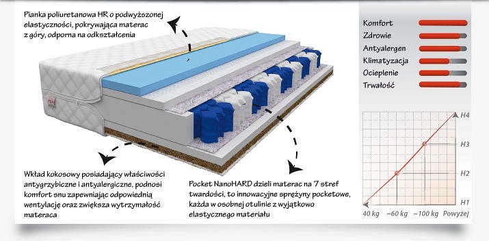 | Wypełnienie | Kokos, Pianka HR, Pianka poliuretanowa, Pocket |