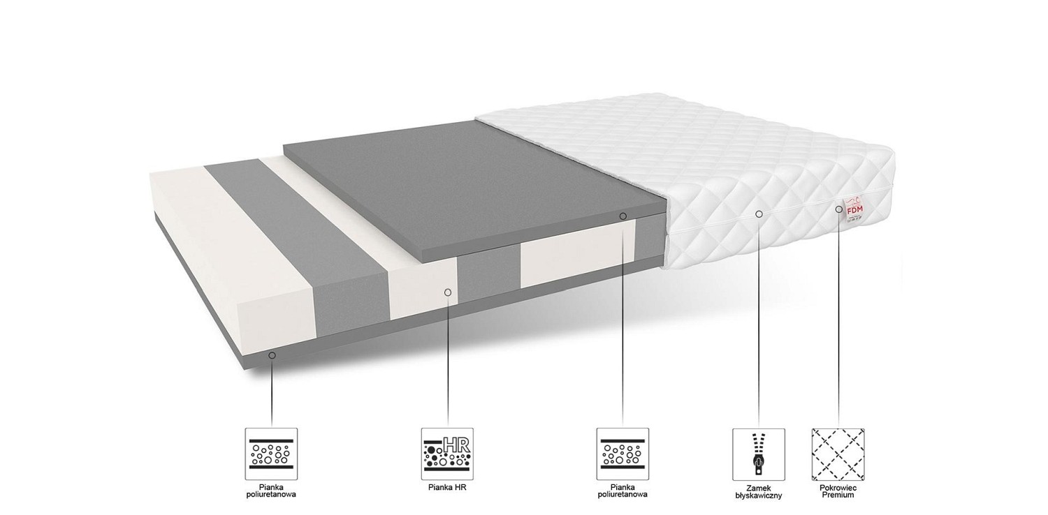 Fundamentem materaca LUIGI jest wysokiej jakości, strefowa pianka, wysokoelastyczna HR. Posiada niejednolitą strukturę komórkową, dzięki czemu uzyskuje lepsze parametry podtrzymywania ciała, komfortu oraz sprężystości. Jej dodatkowym atutem jest doskonała wentylacja oraz odporność na odkształcenia. Otoczona jest obustronnie pianką poliuretanową T25, która sprawia, że materac jest jeszcze trwalszy.