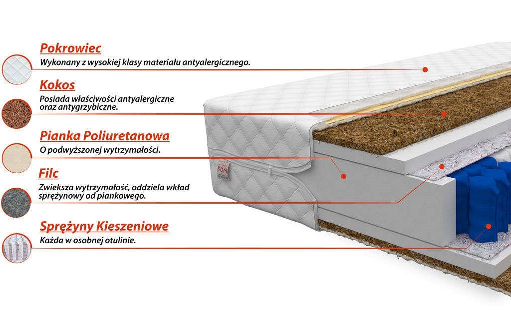 Materac MERANO jest modelem posiadającym formatkę pocketową (kieszonkową). Sprężyny pocketowe zostały wykonane w technologii NanoHARD, podwójnie hartowany drut znacznie przedłuża ich żywotność. Dzięki zastosowaniu 7-stref o zróżnicowanej twardości materac zapewnia ergonomiczną pozycję ciała podczas wypoczynku. Niezależna praca sprężyn, eliminuje efekt wyginania się dużej powierzchni materaca przy nacisku na jego małą powierzchnię. Dzięki czemu wszelkiego rodzaju obracanie, czy wiercenie nie będzie odczuwalne dla drugiej osoby.