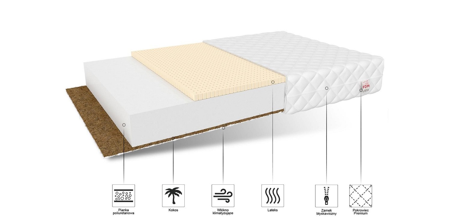 - Warstwa naturalnego kokosa, który jest przewiewny i posiada właściwości antyalergiczne.