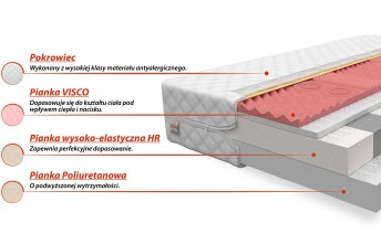 Model ten powstał z kombinacji kilku warstw pianek syntetycznych, wykorzystując ich unikatowe cechy. Materac ROVIGO powstał z połączenia strefowej pianki wysokoelastycznej HR oraz pianki poliuretanowej T25, o podwyższonej wytrzymałości. Dzięki takiemu zestawieniu materac cechuje wyjątkowa odporność na odkształcenia oraz doskonałe dopasowanie do sylwetki użytkownika. Wysoka jakość pianek zapewnia bardzo dobre podparcie dla kręgosłupa, jak i całego ciała.