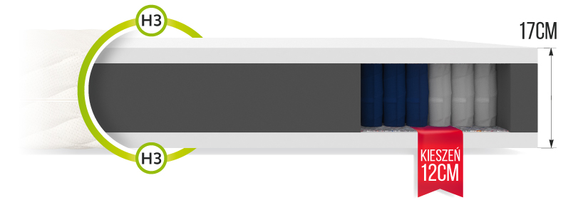 TREVISO jest klasycznym modelem należącym do grupy materacy pocketowych. Jego rdzeń stanowi formatka pocketowa (kieszonkowa). Sprężyny pocketowe zostały wykonane w technologii NanoHARD, podwójnie hartowany drut znacznie przedłuża ich żywotność. Dzięki zastosowaniu 7-stref o zróżnicowanej twardości materac zapewnia ergonomiczną pozycję ciała podczas wypoczynku. Niezależna praca sprężyn, eliminuje efekt wyginania się dużej powierzchni materaca przy nacisku na jego małą powierzchnię. Dzięki czemu wszelkiego rodzaju obracanie, czy wiercenie nie będzie odczuwalne dla drugiej osoby. Wkład kieszeniowy otacza pianka poliuretanowa T25, odporna na odkształcenia, wytrzymała i elastyczna. Stabilizuje sylwetkę użytkownika w czasie wypoczynku.