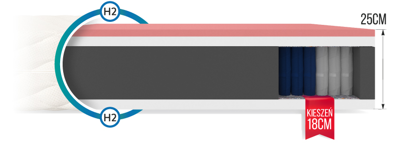 Bazę materaca VERO MAX stanowi formatka pocketowa (kieszonkowa). Sprężyny pocketowe zostały wykonane w technologii NanoHARD, podwójnie hartowany drut znacznie przedłuża ich żywotność. Dzięki zastosowaniu 7-stref o zróżnicowanej twardości materac zapewnia ergonomiczną pozycję ciała podczas wypoczynku. Niezależna praca sprężyn, eliminuje efekt wyginania się dużej powierzchni materaca przy nacisku na jego małą powierzchnię. Dzięki czemu wszelkiego rodzaju obracanie, czy wiercenie nie będzie odczuwalne dla drugiej osoby