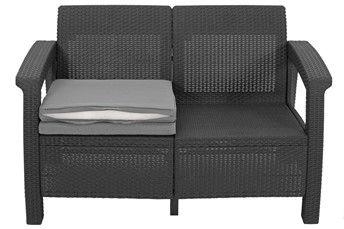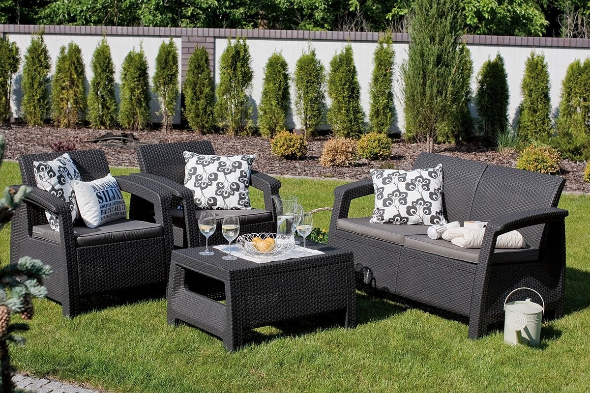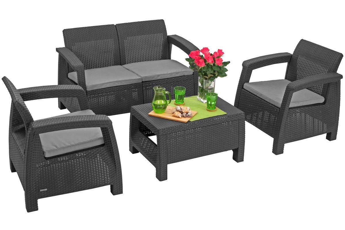 Zestaw krzeseł ogrodowych KORFU 4-osobowy, sofa, dwa fotele i stolik. Eleganckie meble do salonu Corfu dla czterech osób. W skład zestawu wchodzi wygodna dwuosobowa sofa, dwa fotele oraz niski stolik kawowy. Mebel nadaje się do użytku na zewnątrz i doskonale sprawdzi się na patio, balkonie czy tarasie. Konstrukcja mebla wykonana jest z tworzywa polipropylenowego, które charakteryzuje się wyjątkową odpornością na warunki atmosferyczne i promieniowanie UV. Jest to mocny i trwały materiał, który gwarantuje wieloletnie użytkowanie i jest łatwy w czyszczeniu. Mebel pokryty delikatną, matową imitacją faktury. Dzięki temu prezentują się bardzo elegancko i nowocześnie oraz dobrze komponują się z innymi elementami dekoracyjnymi wykonanymi z rattanu, rattanu czy wikliny.