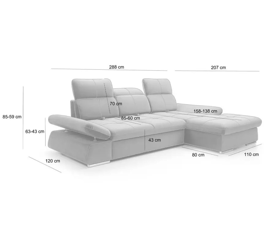 Regulacja zagłówków i podłokietników pozwala dopasować pozycję siedzenia do indywidualnych preferencji, aby zapobiec napięciom mięśniowym czy bólom kręgosłupa. Wbudowany pojemnik na pościel będzie idealny do przechowywania pościeli.