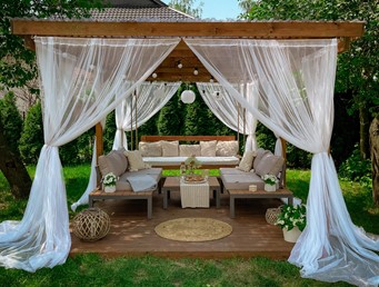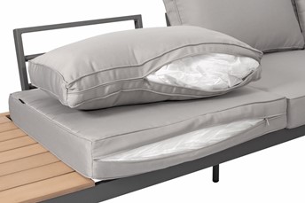 Elegancki narożnik ogrodowy BALI wyróżnia się nowoczesnym stylem i wysoką jakością wykonania. Składa się z dwóch sof 2-osobowych o wymiarach 166 x 80 x 64 cm, narożnika 80 x 80 x 64 cm, stolika 80 x 80 x 34 cm oraz 5 poduszek na siedziska i 6 oparć. Elementy można ustawić osobno lub połączyć w narożnik o łącznych wymiarach 246 x 246 x 64 cm. Korpus serii wykonany jest z aluminium malowanego proszkowo na kolor ciemnoszary. Mocna konstrukcja wytrzymuje obciążenie do 120 kg na siedzenie. Półki boczne oraz blat wykonane są z desek polywood - mieszanki naturalnego drewna i materiałów sztucznych, która doskonale sprawdza się w warunkach zewnętrznych i nie wymaga odnawiania. Stoliki wzorowane są na drewnie egzotycznym - mają stonowany odcień brązu z ciemniejszymi nieregularnymi paskami dla uzyskania naturalnego wyglądu.